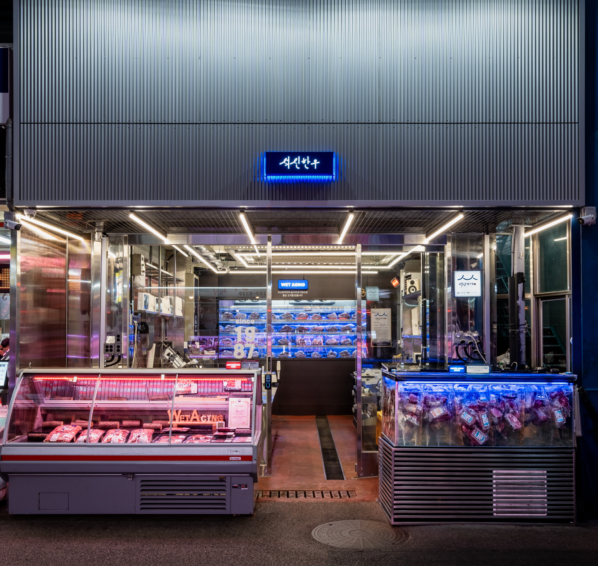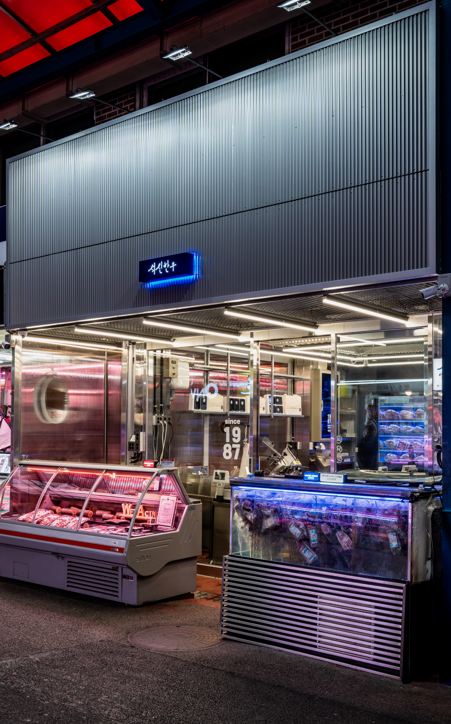 30년을 노지나 다름 없는 곳에서 더위와 추위에 노출된 직원들의 고충을 해결하는데 중점을 두었습니다. 새로운 매장이지만 전통성을 버리지 않고, 지나치게 돋보이려 하지 않았습니다. 그저 주변에 늘 있더 친근한 공간으로 여겨지길 바랬습니다. 석신한우만의 웻에이징, 워터에이징설비와 작업환경이 그대로 노출될 수 있는 디자인을 추구하였습니다.